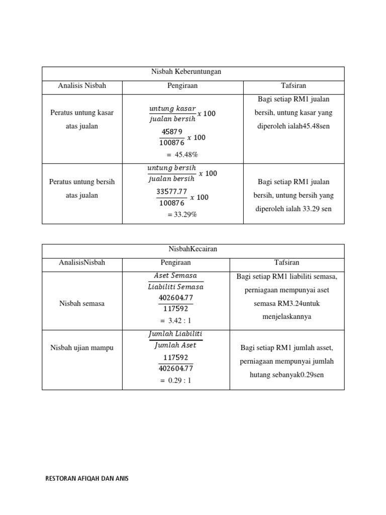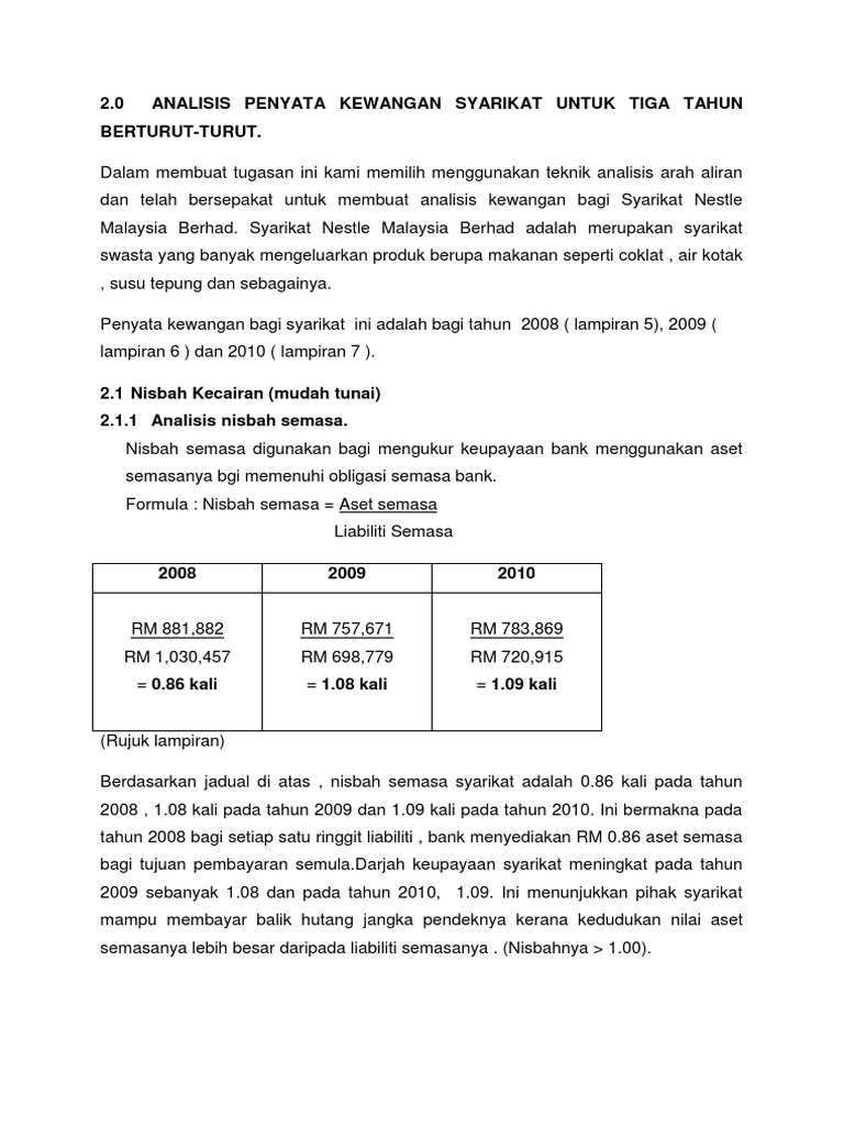 Ketiga-tiga pernyataan inti ini adalah untuk mendapatkan maklumat yang bermakna mengenai syarikat. Nisbah Kewangan Item Maksud Jenis Nisbah Nisbah kecairan. Instrumen kawalan kewangan yg digunakan utk menilai dan mengawal prestasi ssbuah perniagaan NISBAH FORMULA KETERANGAN NISBAH KECAIRAN Mengukur kemampuan perniagaan membuat bayaran kpd pihak bank dan pemiutang dalam jangka pendek iaitu menunjukkan keupayaan perniagaan menjelaskan liability semasa apabila.